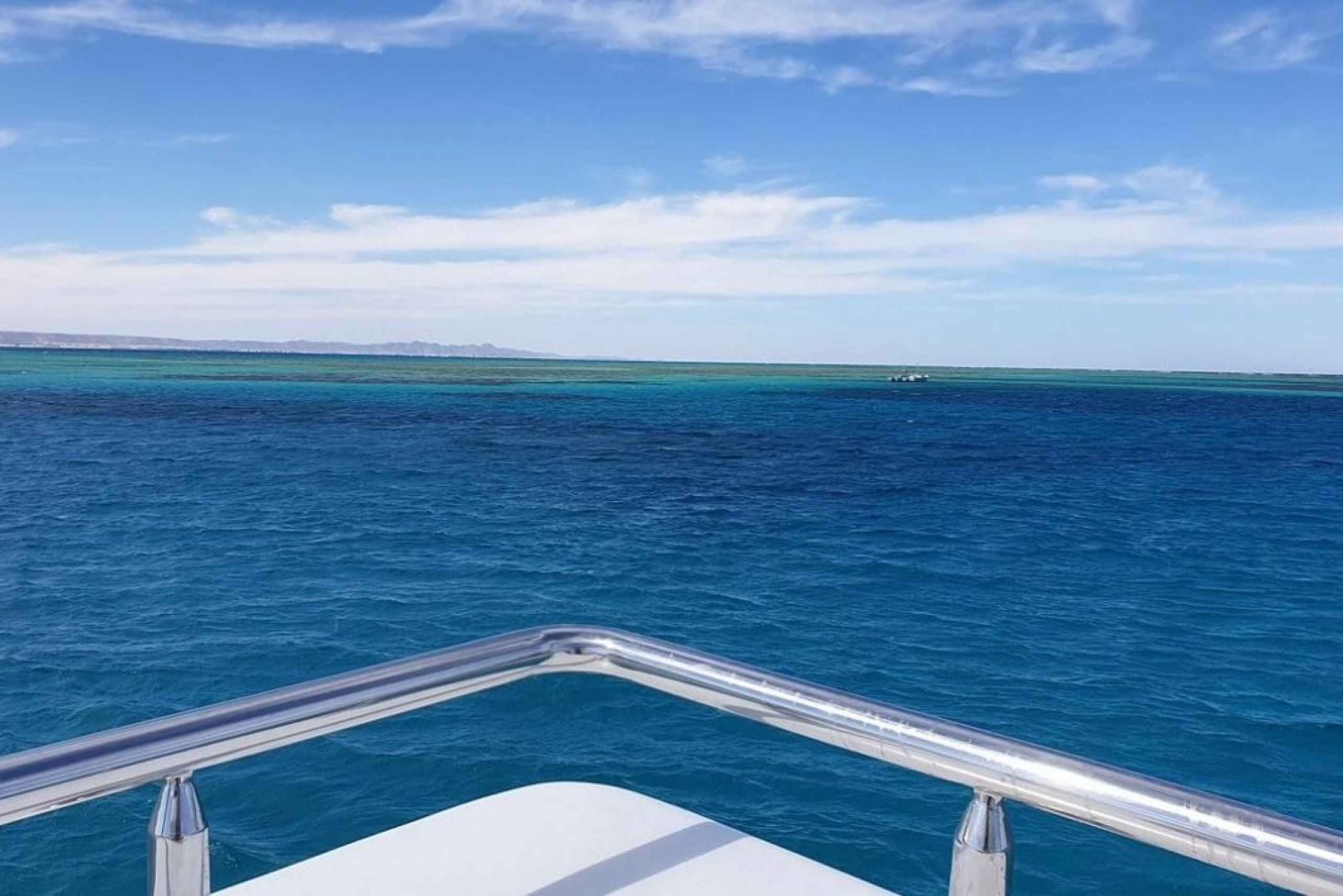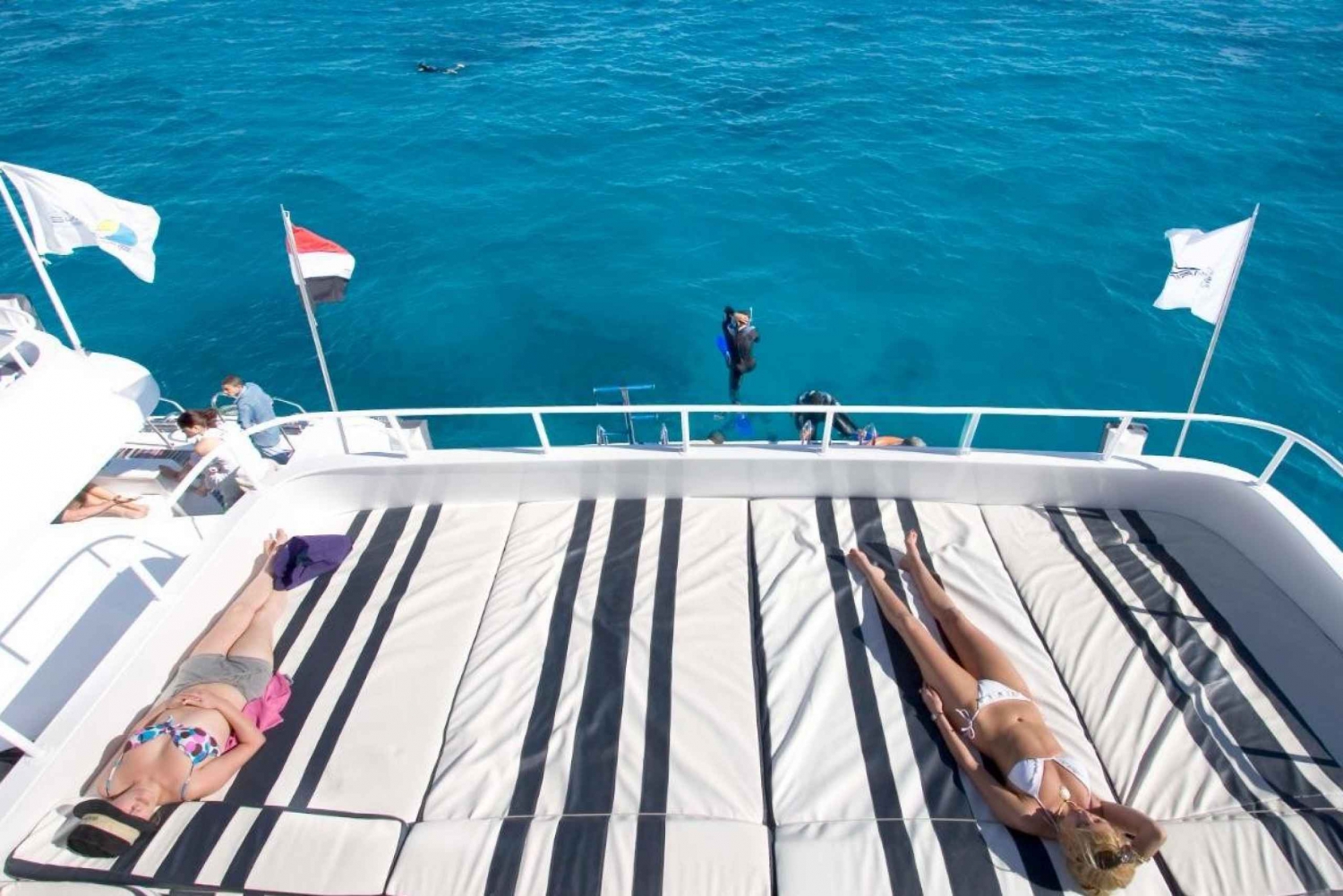 Entdecke auf dieser Tagestour von Sharm El Sheikh zum Ras Mohamed Nationalpark und zur Weißen Insel die außergewöhnliche Landschaft der Küste des Roten Meeres. Entspanne dich auf einer komfortablen Yacht, leihe dir eine Schnorchelausrüstung und genieße ein Mittagsbuffet. Erweitere dein Erlebnis, indem du 1 oder 2 Schnuppertauchgänge zu deiner Tour hinzufügst. Beginne mit der Abholung von deiner Unterkunft in Sharm El Sheikh und entspanne dich auf dem nahtlosen Bustransfer zur Jacht. Gehe an Bord einer sauberen und gut gewarteten Yacht, die über ein modernes und geräumiges Sonnendeck und einen luxuriösen Salon auf dem Unterdeck verfügt. Spüre die Meeresbrise in deinen Haaren, während du über das azurblaue Wasser zur Küste von White Island gleitest, um ein erfrischendes Bad zu nehmen. Mach dich auf den Weg zu beliebten Schnorchelplätzen im Ras-Mohamed-Nationalpark wie dem Yolanda-Riff, dem Haifisch-Riff, der South Bereika Bay, Marsa Ghozlani und Old Quay. Leih dir eine Schnorchelausrüstung, um eine Unterwasserwelt voller bunter Fische zu erkunden, und lass dich von Schnorchelführern begleiten, um deine Chancen zu erhöhen, Meeresbewohner zu entdecken. Streng deinen Appetit an, bevor du dir ein leckeres Mittagsbuffet gönnst. Genieße das Essen, das nach den höchsten Hygienestandards und mit marktfrischen Zutaten zubereitet wird. Es gibt frisch zubereitete Salate, Reis, Nudeln, Kartoffeln, Hühnchen und ägyptisches Kofta. Genieße beim Essen den Meerblick vom Boot aus. Während der Fahrt kannst du unbegrenzt Wasser, Softdrinks und Heißgetränke trinken. Fahre zurück zum Yachthafen und lass dich mit unvergesslichen Erinnerungen an deinen Tag auf dem Roten Meer zu deinem Hotel bringen.Includes