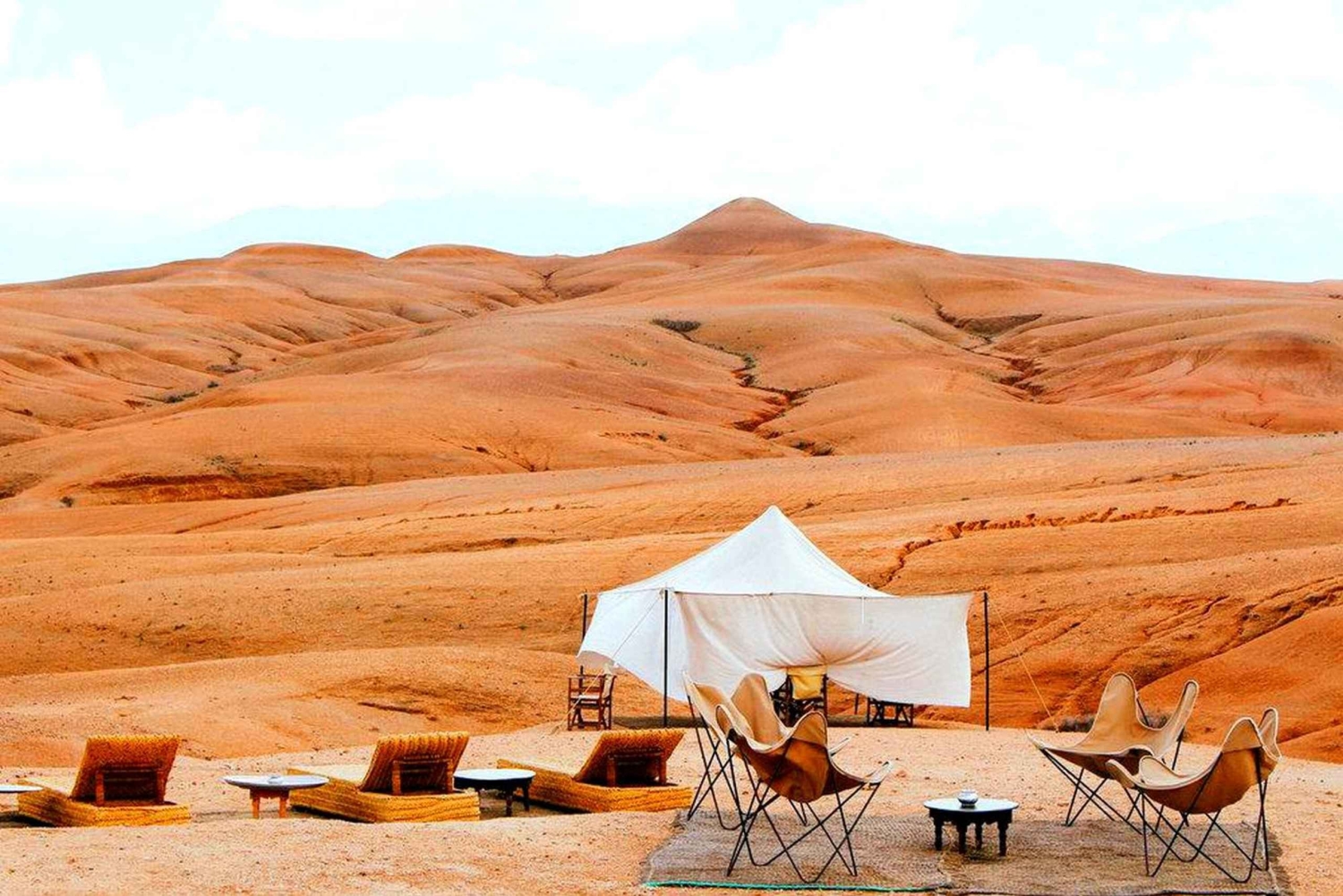 Посетите пустыню Агафай во время тура на закате из Марракеша. Откройте для себя захватывающие дух виды пустыни с берберскими деревнями и оливковыми полями на фоне Атласских гор. Наслаждайтесь поездкой на верблюде и ужином под удивительными звездами пустыни. Вас заберут из отеля в Марракеше и сядут на микроавтобус через холмы. Через тридцать минут вы прибудете в лагерь, где переоденетесь в сахарскую одежду. Совершите 20-минутную поездку на верблюде, любуясь пейзажами пустыни. После этого выпейте свежий мятный чай и полюбуйтесь закатом. После захода солнца садитесь ужинать под ясным ночным небом. Послушайте марокканскую берберскую музыку у костра и окунитесь в атмосферу, наслаждаясь едой. Когда вы закончите ужинать, вас отвезут обратно в отель в Марракеше.Includes