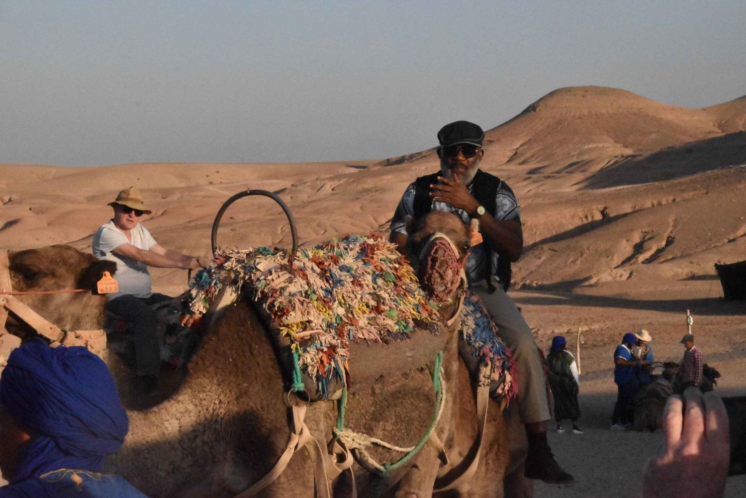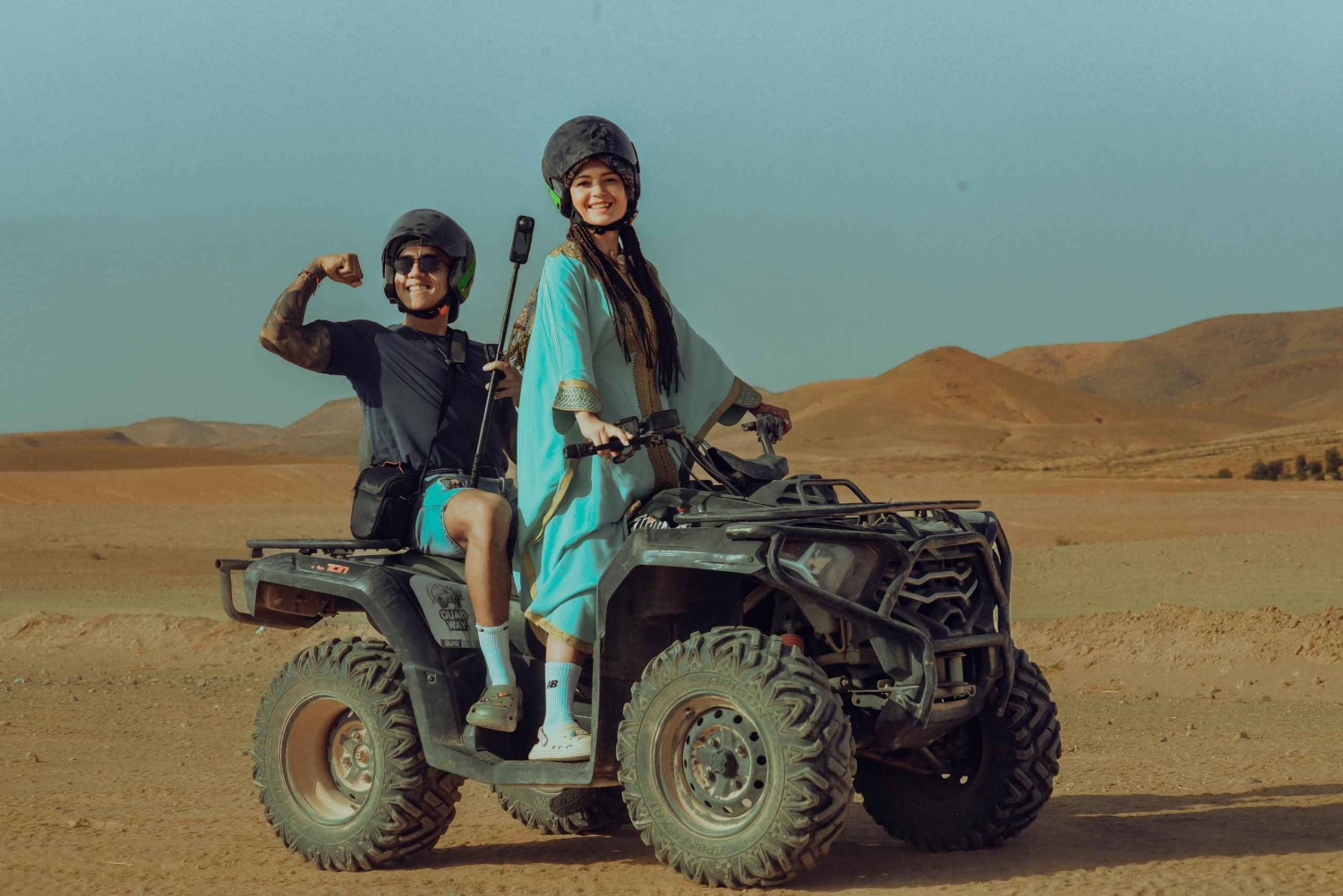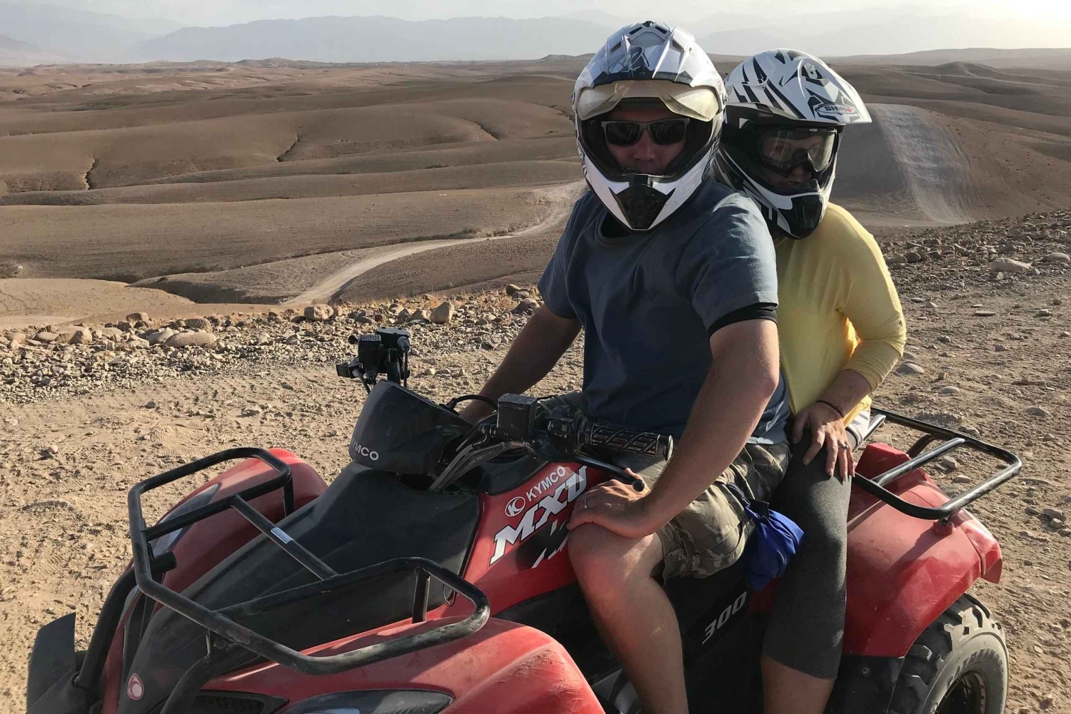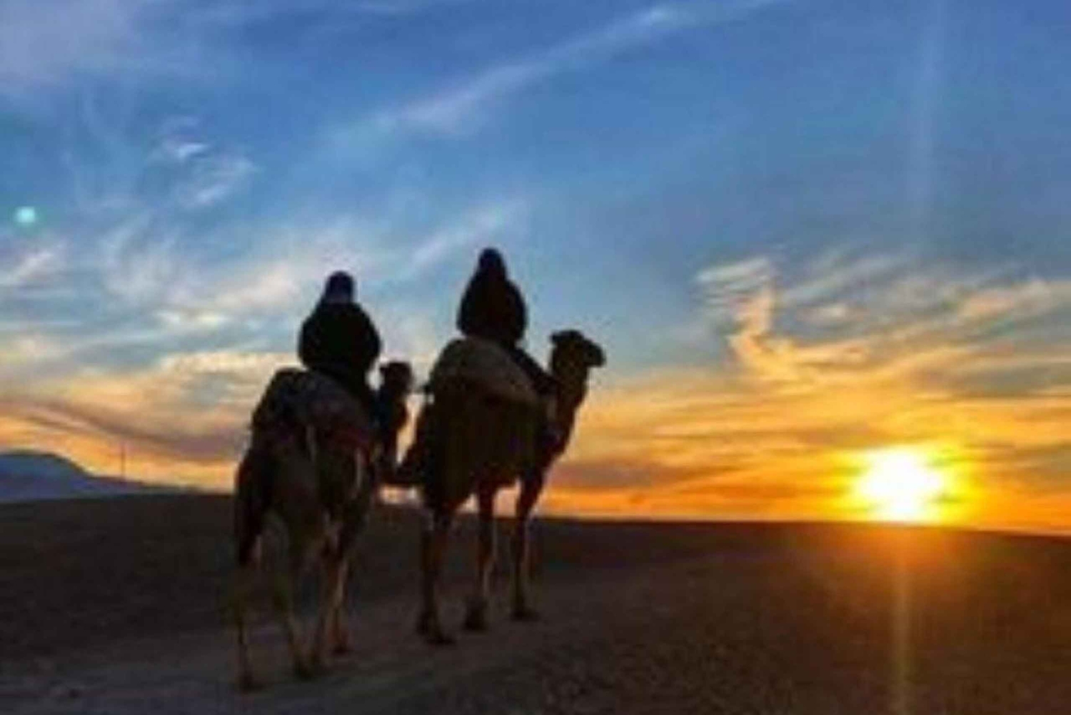 Катание на квадроциклах • Катание на верблюдах • Виды на закат • Ужин и шоу • Трансфер из отеля Приглашаем вас провести незабываемый вечер в пустыне Агафай, расположенной недалеко от Марракеша. В программу входит захватывающая поездка на квадроциклах, спокойная прогулка на верблюдах на закате, традиционный марокканский ужин и увлекательное шоу под звездами. --- Трансфер из отеля С 14:00 до 17:00 вас бесплатно заберут прямо из отеля в Марракеше. Обратите внимание: посещение риадов в Медине на автомобиле невозможно. Местом встречи будут ближайшие доступные ворота или площадь. Путешествуйте в комфортабельном микроавтобусе с кондиционером по живописным ландшафтам в пустынный лагерь в Агафае – скалистой местности с панорамным видом на горы Атлас, аутентичной альтернативе Сахаре. --- Катание на квадроциклах: острые ощущения на бездорожье Наденьте шлем и очки и прокатитесь по пересеченным тропам Агафая. Под руководством профессиональных инструкторов, говорящих на английском, французском и арабском языках, это безопасное и удобное для новичков мероприятие наполнено адреналином. Небольшие группы обеспечивают более индивидуальный подход к приключениям. --- Катание на верблюде на закате — марокканская традиция Замедлитесь, совершив спокойную прогулку на верблюдах, пока солнце садится за горизонт пустыни. Идеально подходит для пар, семей и одиночных путешественников, а также для съемки незабываемых фотографий с потрясающими пустынными пейзажами. --- Ужин и живое шоу под звездами С наступлением ночи вас ждет марокканский ужин, включающий: Тажин Кускус Марокканская выпечка Ужин подается в просторных берберских шатрах. Вечером вас ждут живая музыка гнава, фольклорные танцы и захватывающее огненное шоу от профессионального артиста, создающее волшебную атмосферу. На территории также имеется бассейн (по желанию). --- Полезная информация Рекомендуется надеть удобную одежду и закрытую обувь. Возьмите с собой легкую куртку (в пустыне ночью может быть прохладно). Не забудьте взять с собой фотоаппарат и солнцезащитный крем. Вода включена в стоимость ужина. --- Для кого это предназначено? Искатели приключений Любителям культуры Парам и семьям Любителям фотографии Для всех, кто ищет уникальные впечатления в Марокко --- ✅ Что включено Приключение на квадроцикле Катание на верблюде на закате Марокканский ужин (таджин, кускус, харира, выпечка) Живая музыка, танцы и огненное шоу Трансфер в обе стороны на микроавтобусе. Страхование и защитное снаряжение Посещение бассейна (по желанию) --- ⭐ Главное Катание на квадроциклах в Марракеше Катание на верблюде в Марокко Сафари на закате в пустыне Агафай Подлинное берберское гостеприимство и культура Уникальные вечерние экскурсии из Марракеша --- Почему стоит забронировать у нас? Это не просто экскурсия, а культурное путешествие, сочетающее марокканские традиции с первозданной красотой пустыни. Забронируйте заранее, чтобы получить лучшие впечатления от пустыни Агафай в 2025 годуIncludes
