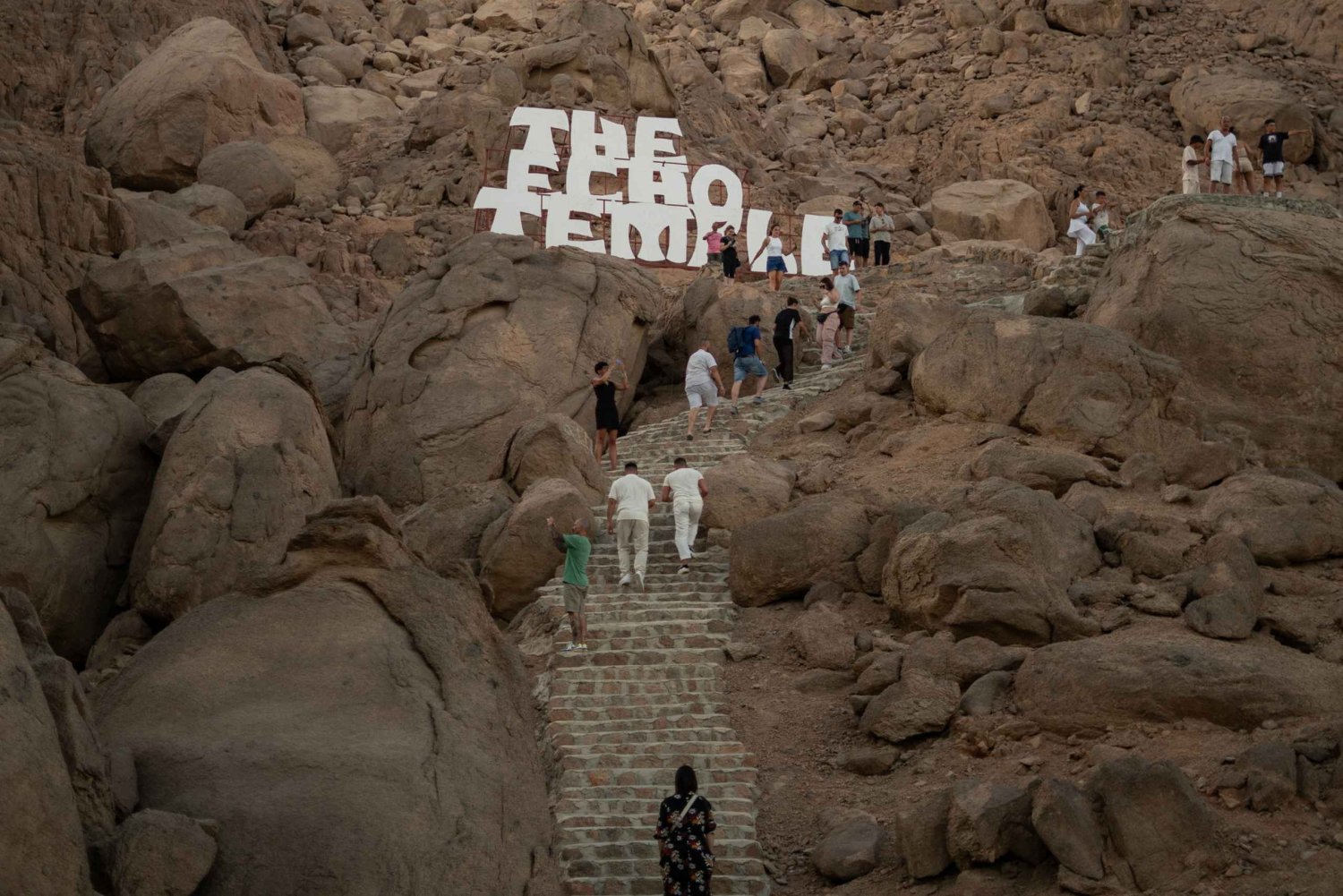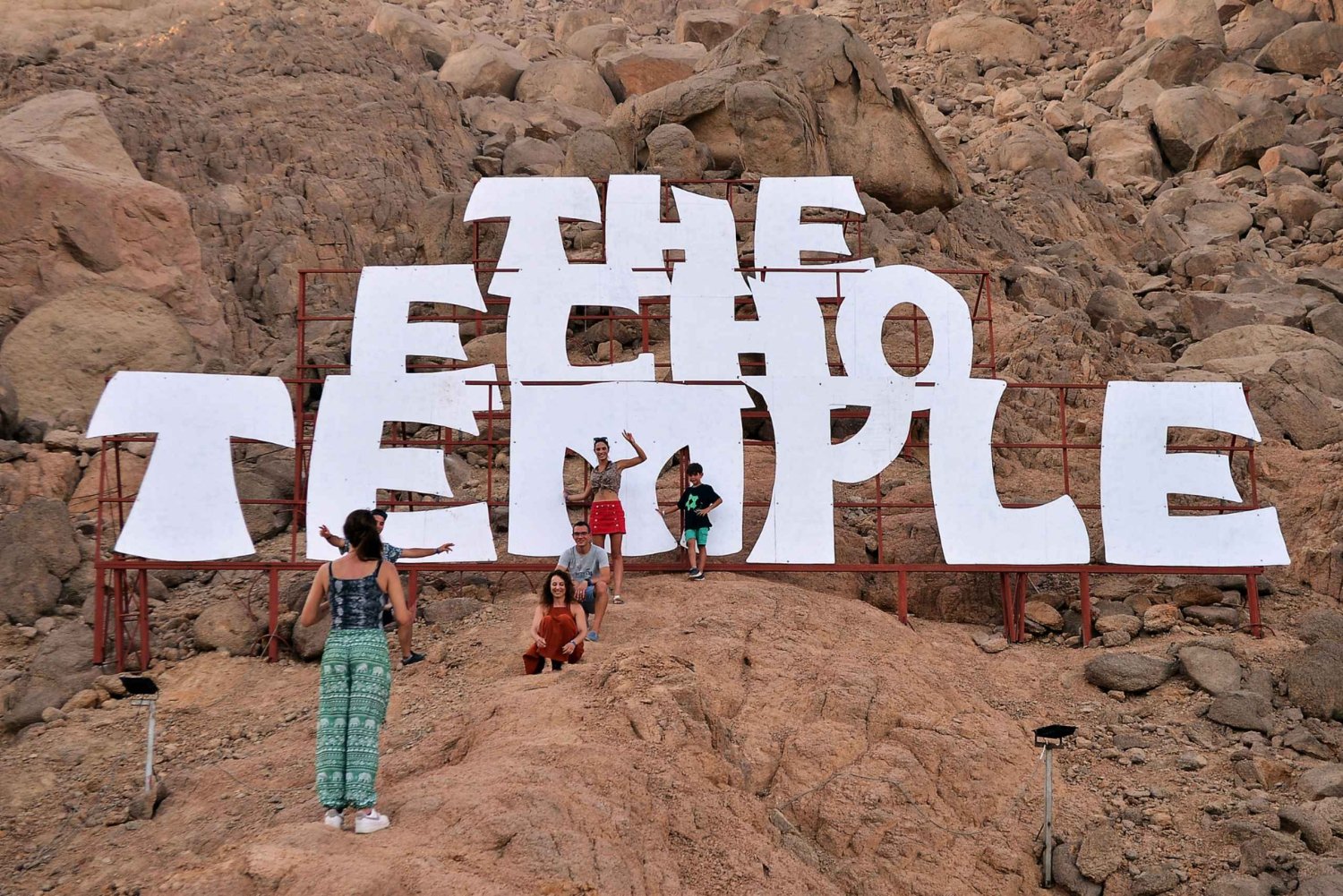 Kliv in i hjärtat av Sinaiöknen och upplev en oförglömlig arabisk natt på The Echo Temple – Sharm El Sheikhs ikoniska beduinlounge och kulturella destination. Den här upplevelsen är utformad för att fördjupa dig i öknen, dess skönhet och traditioner. Den blandar äventyr, natur, gastronomi och äkta beduin-gästfrihet till en magisk kväll. Din resa börjar med en kamelritt runt vår Oasis-plats, som erbjuder en fridfull introduktion till det tidlösa ökenlandskapet. Därifrån tar du en kort guidad vandring till en panoramisk klippa bredvid Echo Temples stenemblem. Här får du se en exotisk solnedgång i öknen med utsikt över både bergen och havet – en av de mest hisnande utsiktsplatserna i regionen. När solen går ner följer du lyktorna tillbaka till beduinlägret, där natten kommer till liv. Drick traditionellt beduin-te medan du kopplar av på bekväma kuddar i ökenloungen. Njut av en nyberedd beduinmiddag med läckra lokala rätter, tillsammans med läsk och vatten. Under hela kvällen underhålls du av en livlig orientalisk show, en eldföreställning och en autentisk beduinstamdans som ger liv åt Sinai-kulturen och rytmen. Efter middagen kan du förlora dig i öknen tystnad och vidsträckthet medan du tittar på stjärnorna under kristallklar himmel, långt från stadens ljus. Din kväll avslutas med en filmisk ökenupplevelse – en kort dokumentär som projiceras på vår utomhusskärm och delar med sig av Sinai beduinstammars historia, livsstil och traditioner. Du kan också besöka vår Henna Art Station, där du kan få en traditionell hennadesign eller ett porträtt ritat av vår konstnär. Den här upplevelsen är perfekt för par, familjer och grupper och fångar essensen av Sinais naturliga skönhet och kulturarv. Det är mer än en middag – det är en stämningsfull kväll som skapats för att skapa minnen som stannar hos dig långt efter att du lämnat öknen.Includes